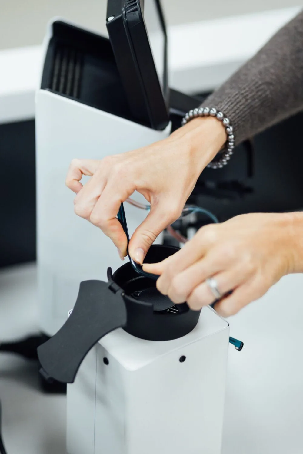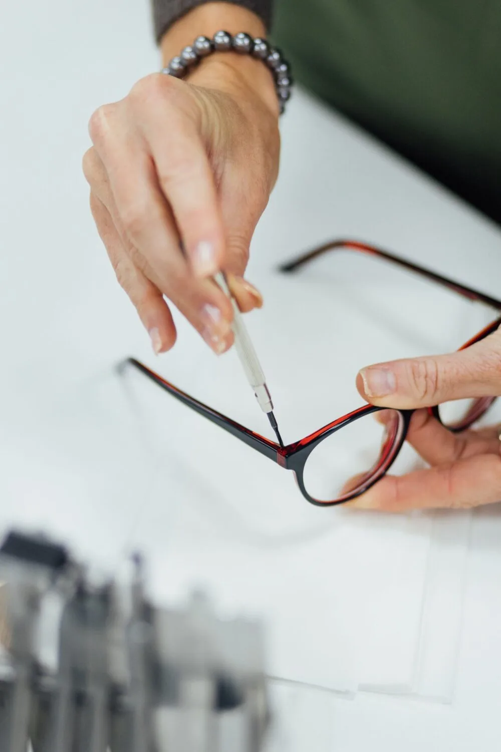 Pomocí optického fénu a přesného tvarování upravíme obruby i koncovky tak, aby vám brýle perfektně padly a dobře držely.